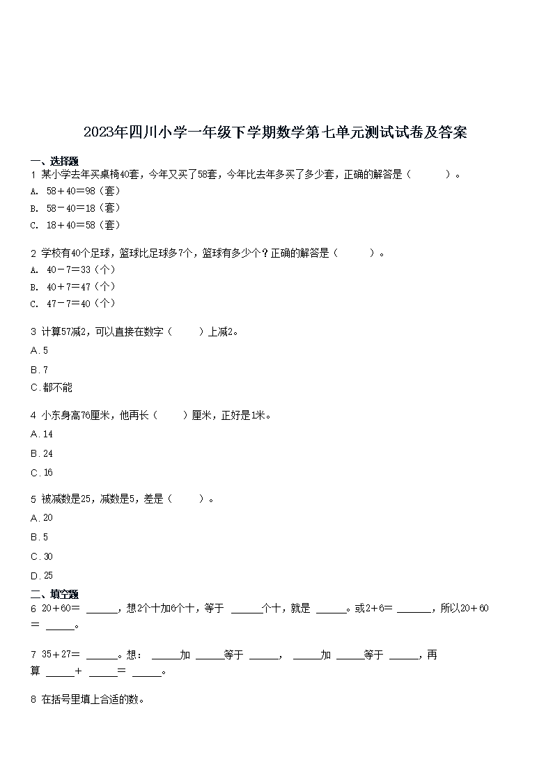 【文档预览】 文档大全网整理发布2023年四川小学一年级下学期数学第七单元测试试卷及答案(Word版),前五页预览如下: