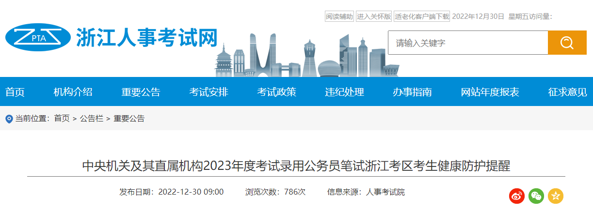 为确保中央机关及其直属机构2023年度考试录用公务员笔试安全顺利进行,现将浙江考区考生健康防护提醒如下: