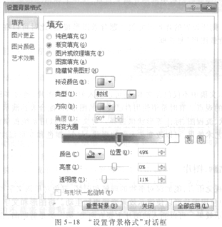 ①单击“设计”选项卡“背景”组的“背景样式”命令,在出现的快捷菜单中选择“设置背景格式”命令,弹出“设置背景格式”对话框。也可以单击“设计”选项卡“背景”组右下角的“设置背景格式”按钮,也能显示“设置背景格式”对话框。如图5—18所示。