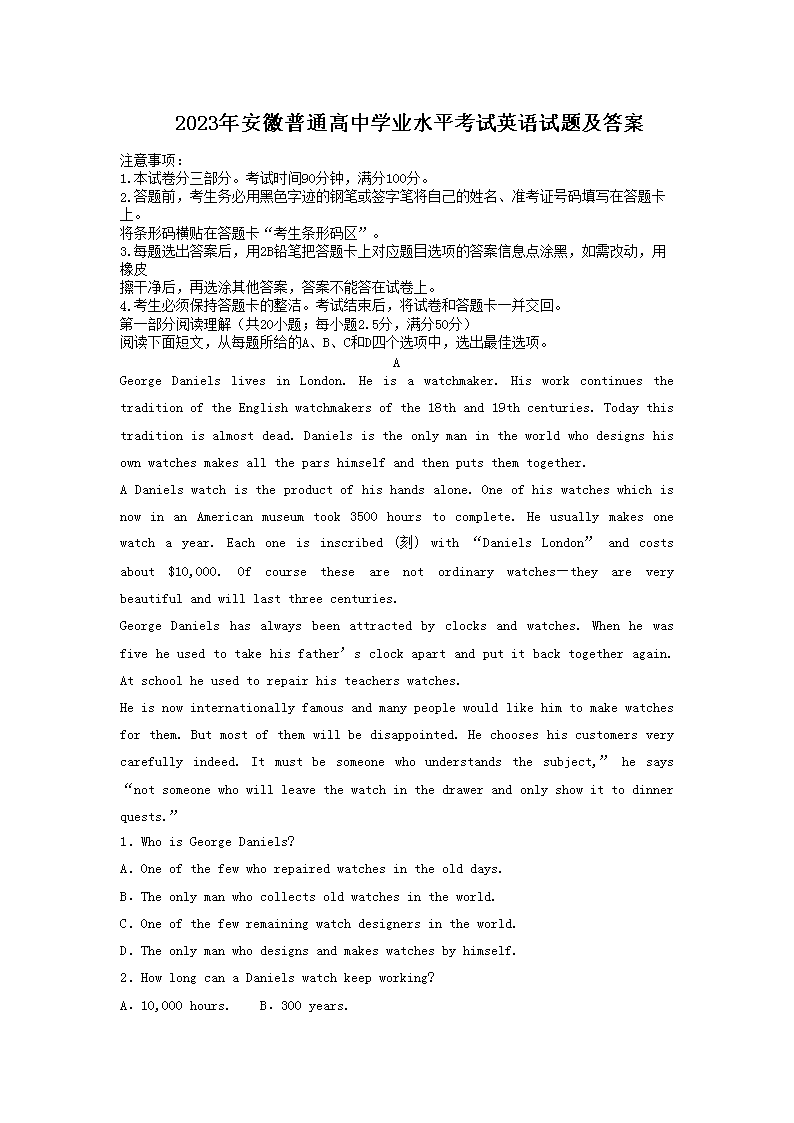 【文档预览】 文档大全网整理发布2023年安徽普通高中学业水平考试英语试题及答案(Word版),前五页预览如下: