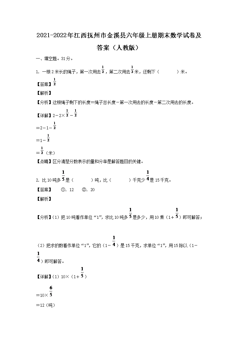 【文档预览】 文档大全网整理发布2021-2022年江西抚州市金溪县六年级上册期末数学试卷及答案(人教版)(Word版),前五页预览如下:
