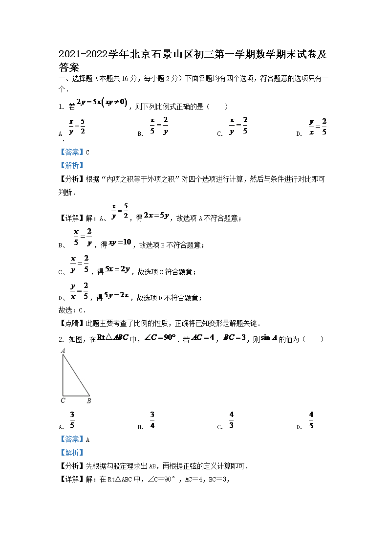2021-2022学年北京石景山区初三第一学期数学期末试卷及答案(Word版)07-04