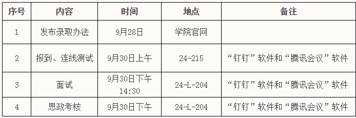 包括专业面试、外语口语测试、思想政治考核。复试采用线上线下相结合的面试形式进行。对本校考生采用到校现场面试方式,其他考生采用线上面试方式,线上面试平台采用“钉钉”软件和“腾讯会议”软件。