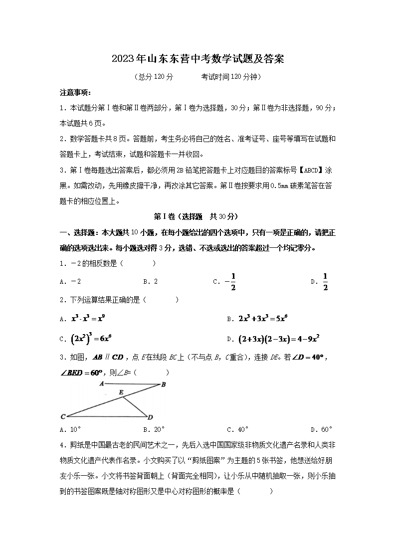 2023年山东东营中考数学试题及答案(Word版)07-01