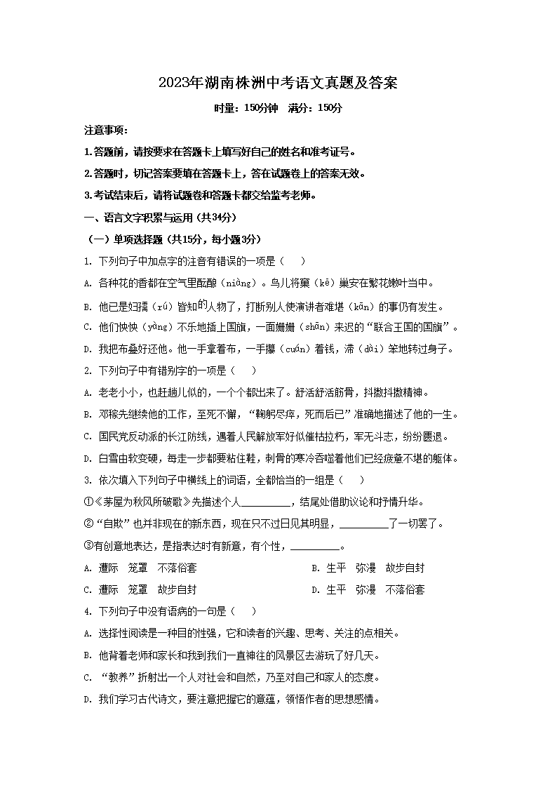 【文档预览】 文档大全网整理发布2023年湖南株洲中考语文真题及答案(Word版),前五页预览如下: