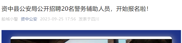 【#招警考试# #2023年四川内江资中县公安局招聘警务辅助人员20名公告(9月25日-10月13日)#】®文档大全网从资中公安公众号获悉,2023年四川内江资中县公安局招聘警务辅助人员20名。报名时间:9月25日-10月13日,更多事宜请参考阅读《招聘公告》,官方公告原文如下: