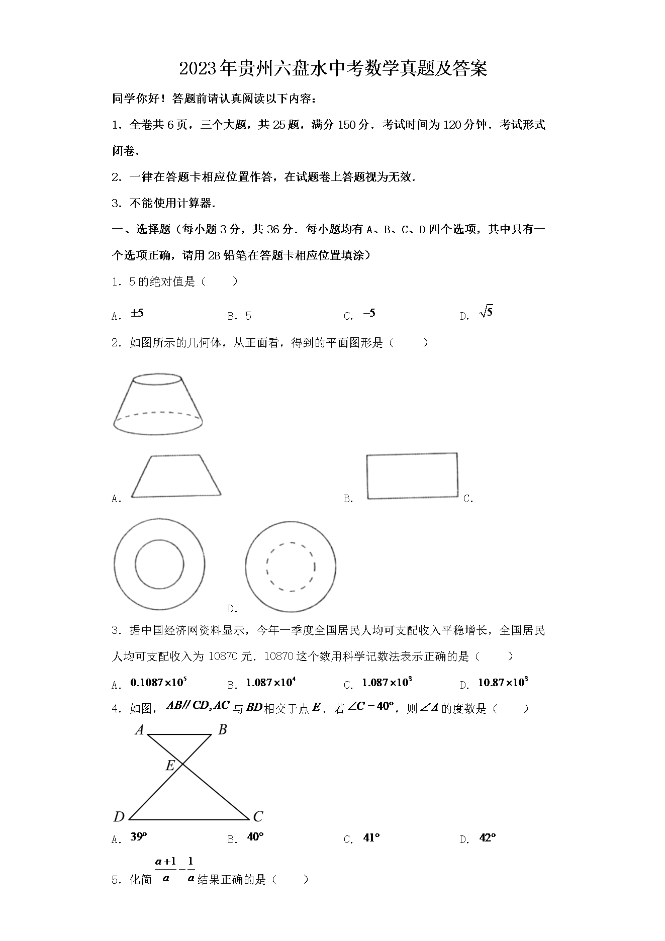 【文档预览】 文档大全网整理发布2023年贵州六盘水中考数学真题及答案(Word版),前五页预览如下: