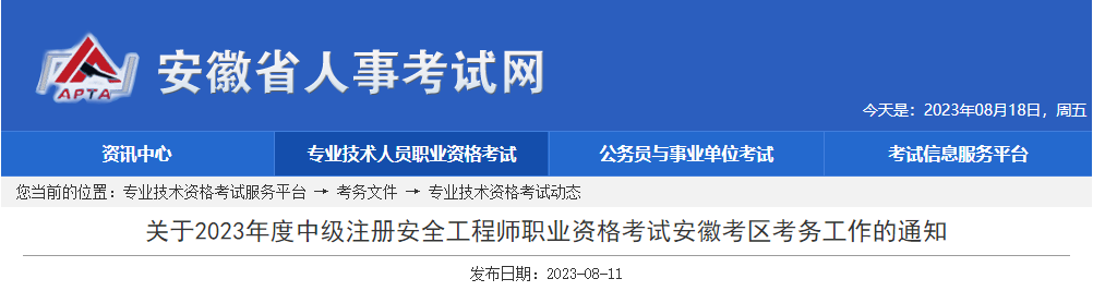 2023年安徽中级安全工程师考试时间:10月28日-29日08-19