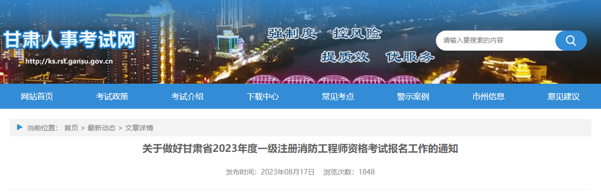 【#消防工程师# 导语】®文档大全网从甘肃人事考试网获悉,《2023年甘肃一级注册消防工程师职业资格考试考务工作通知》现已公布,®文档大全网从公告中了解到,符合条件的考生可在8月25日-9月4日进行网上报名,2023年甘肃一级消防工程师报考条件如下:
