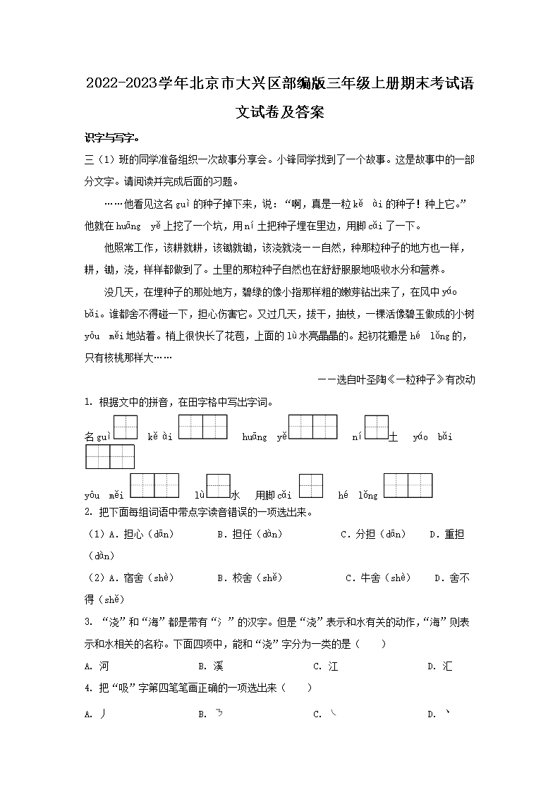 2022-2023学年北京市大兴区部编版三年级上册期末考试语文试卷及答案(Word版)07-01