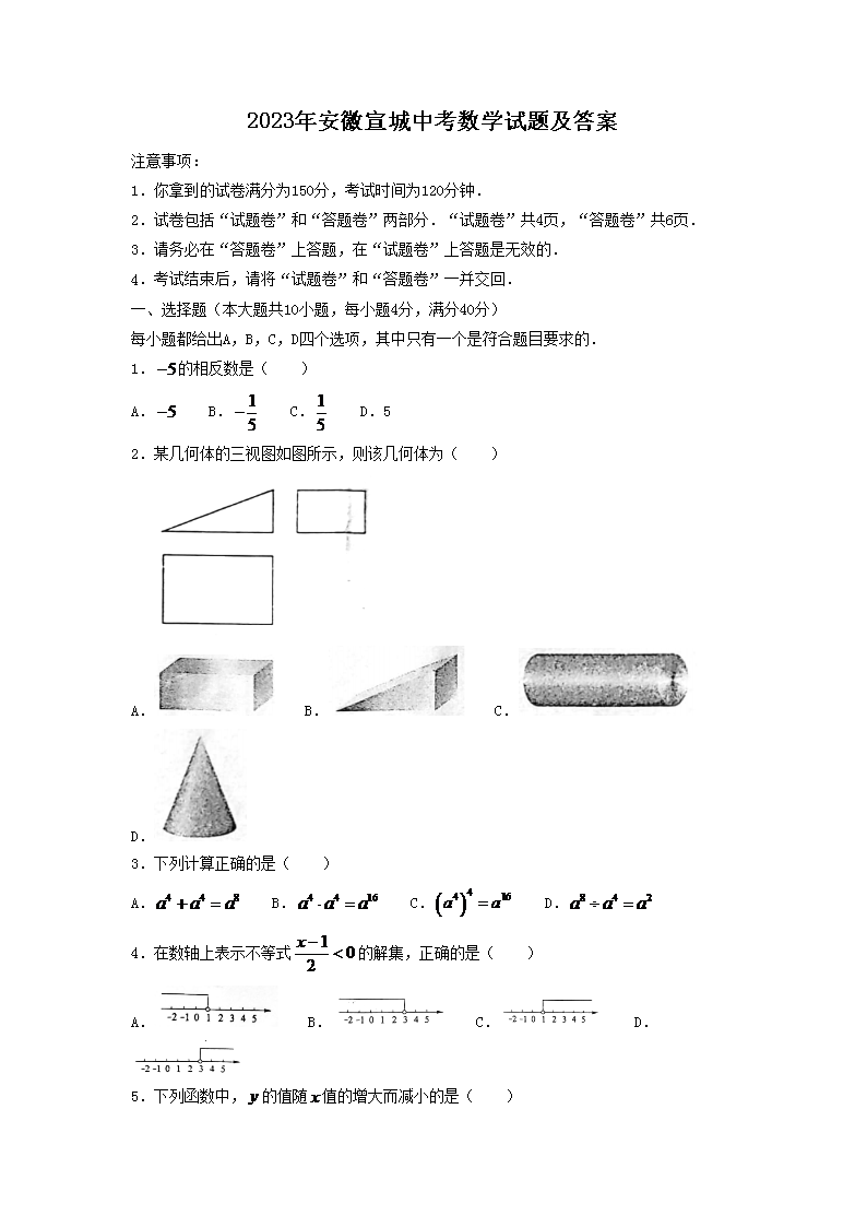 2023年安徽宣城中考数学试题及答案(Word版)06-17