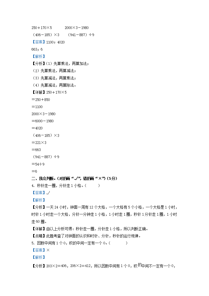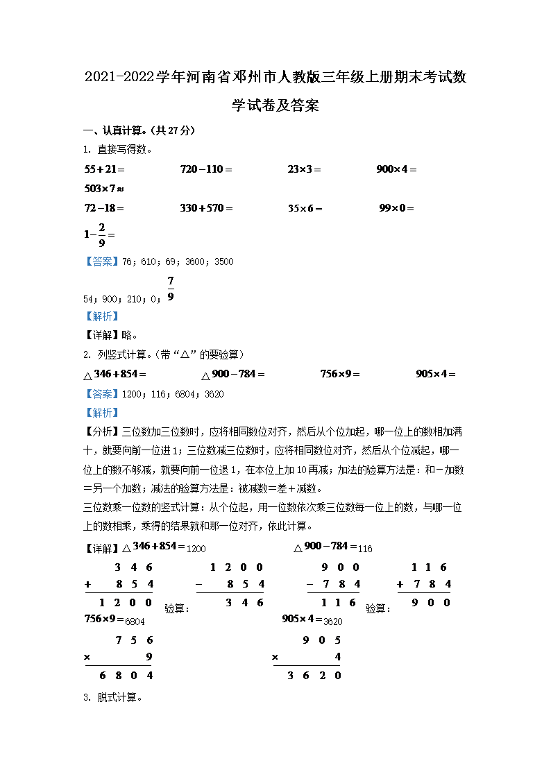 2021-2022学年河南省邓州市人教版三年级上册期末考试数学试卷及答案(Word版)09-29