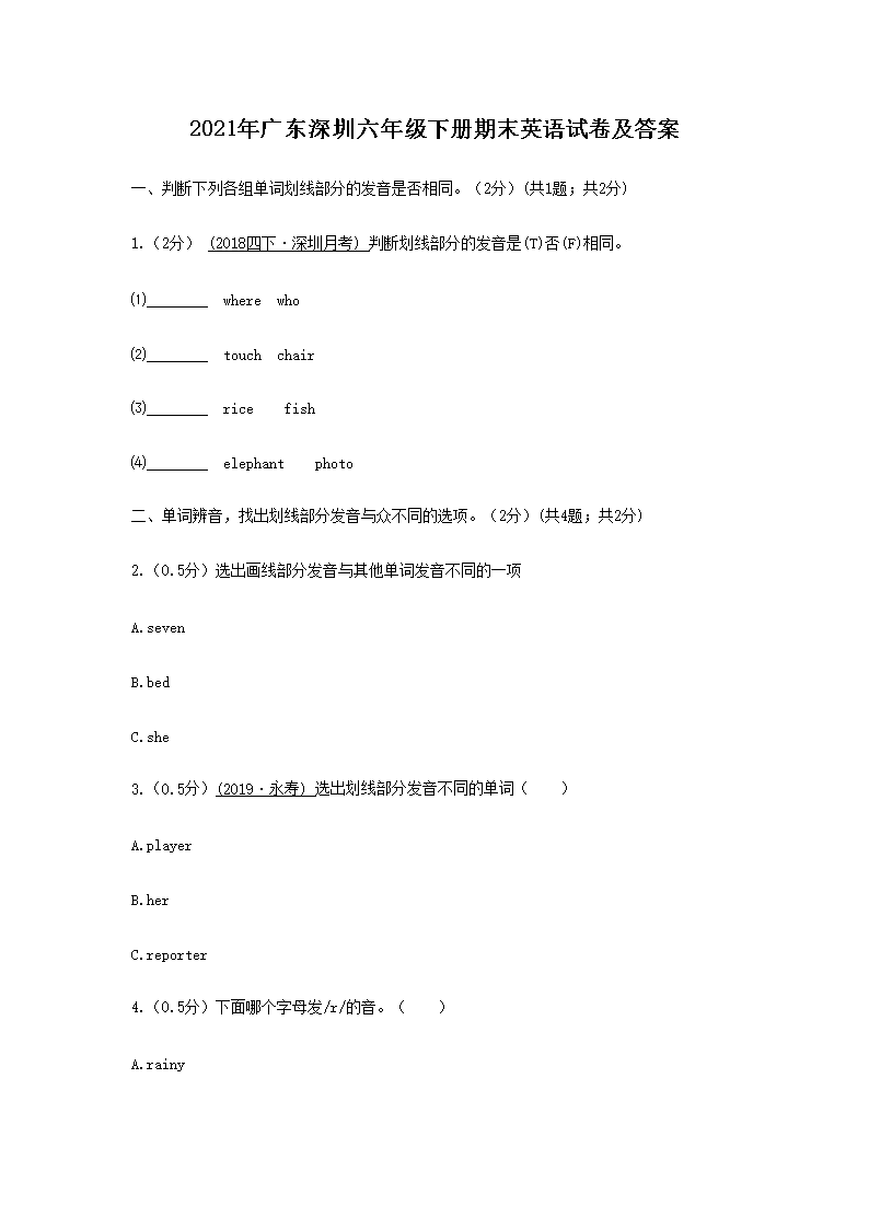 【文档预览】 文档大全网整理发布2021年广东深圳六年级下册期末英语试卷及答案(Word版),前五页预览如下: