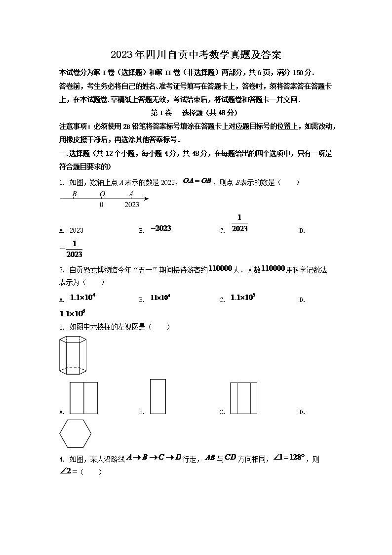 【文档预览】 文档大全网整理发布2023年四川自贡中考数学真题及答案(Word版),前五页预览如下: