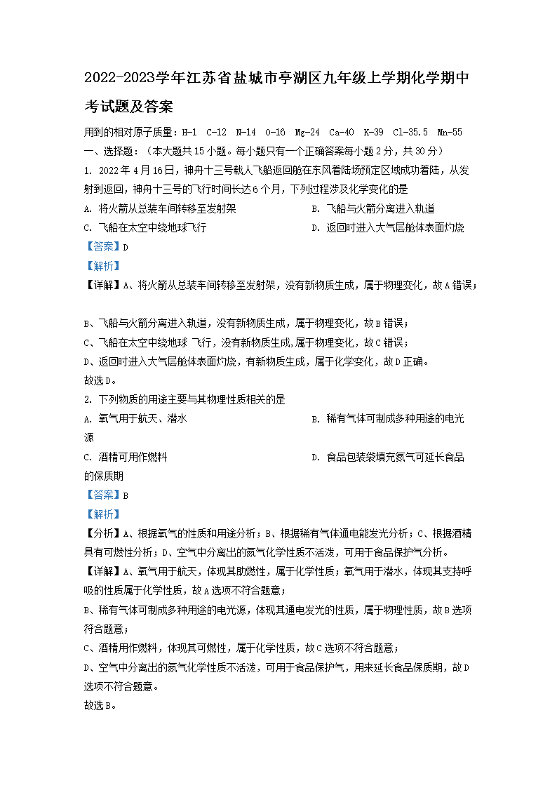 2022-2023学年江苏省盐城市亭湖区九年级上学期化学期中考试题及答案(Word版)09-22