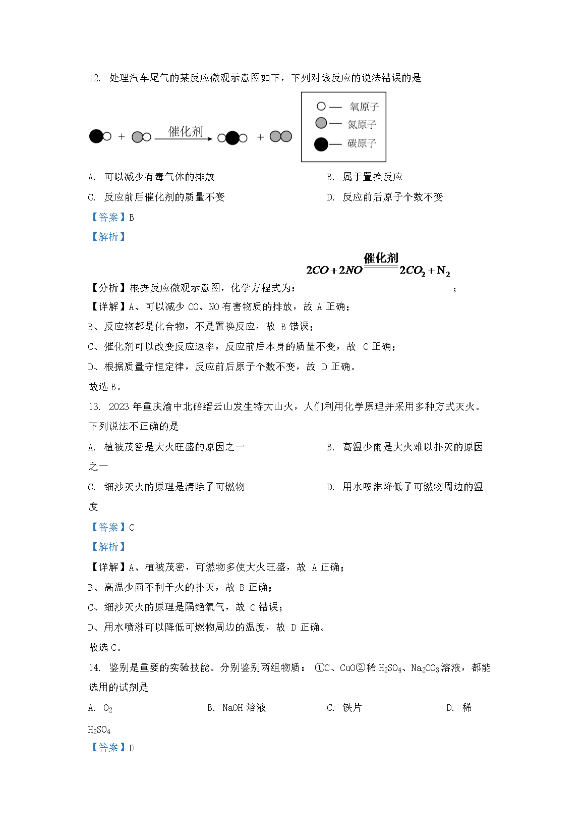 2023年重庆渝中中考化学真题及答案(B卷)(Word版)06-17