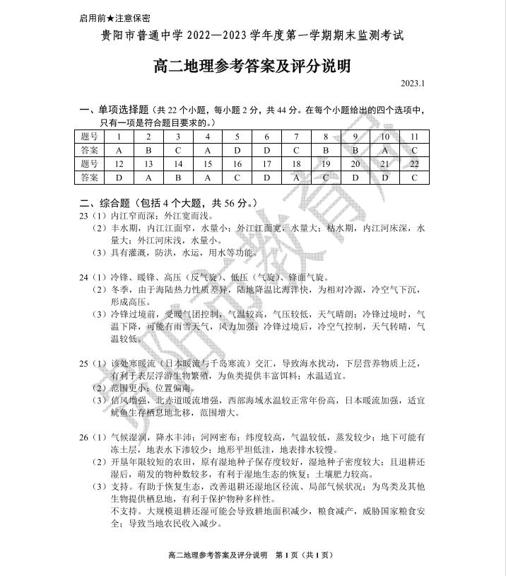 2022-2023年贵州省贵阳市高二地理第一学期期末答案及评分说明02-13