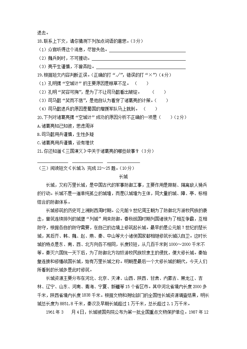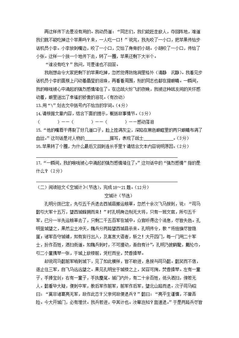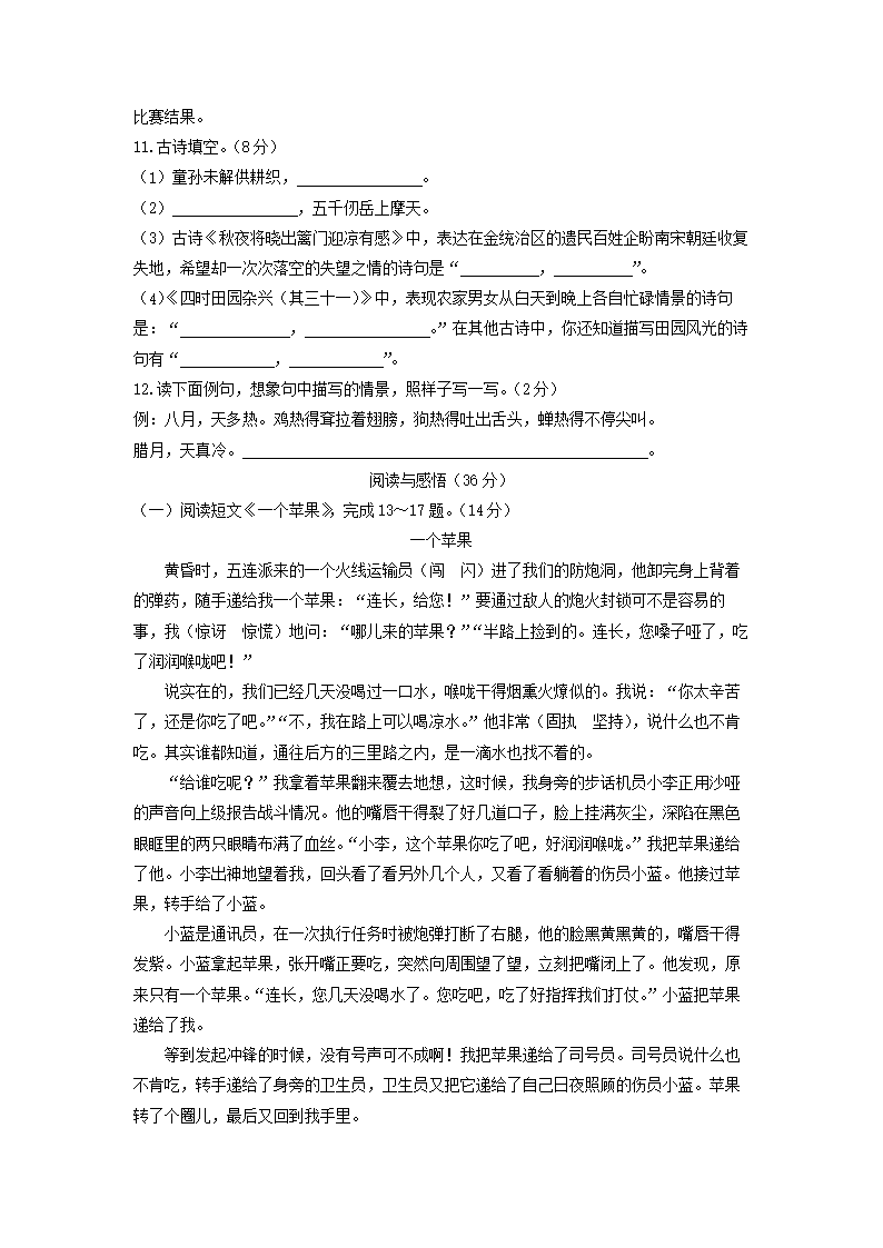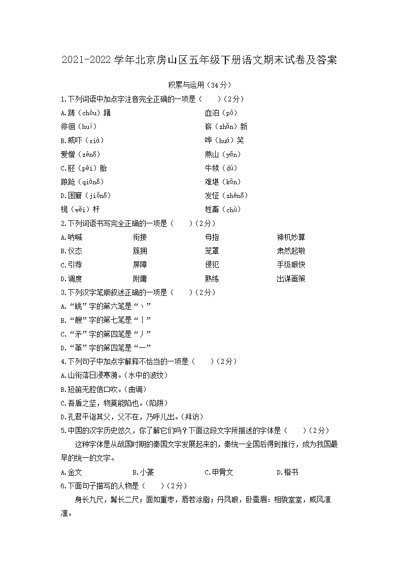 2021-2022学年北京房山区五年级下册语文期末试卷及答案(Word版)06-21