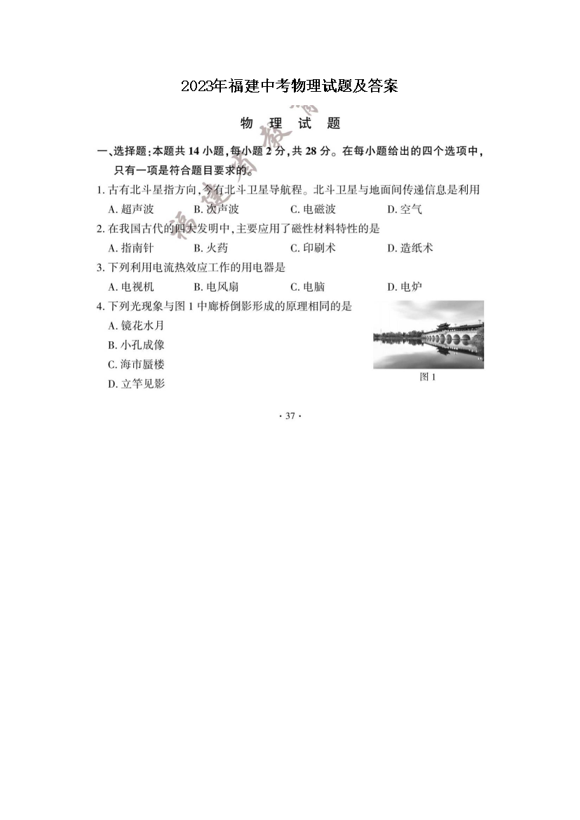 【文档预览】 文档大全网整理发布2023年福建中考物理试题及答案(图片版),前五页预览如下: