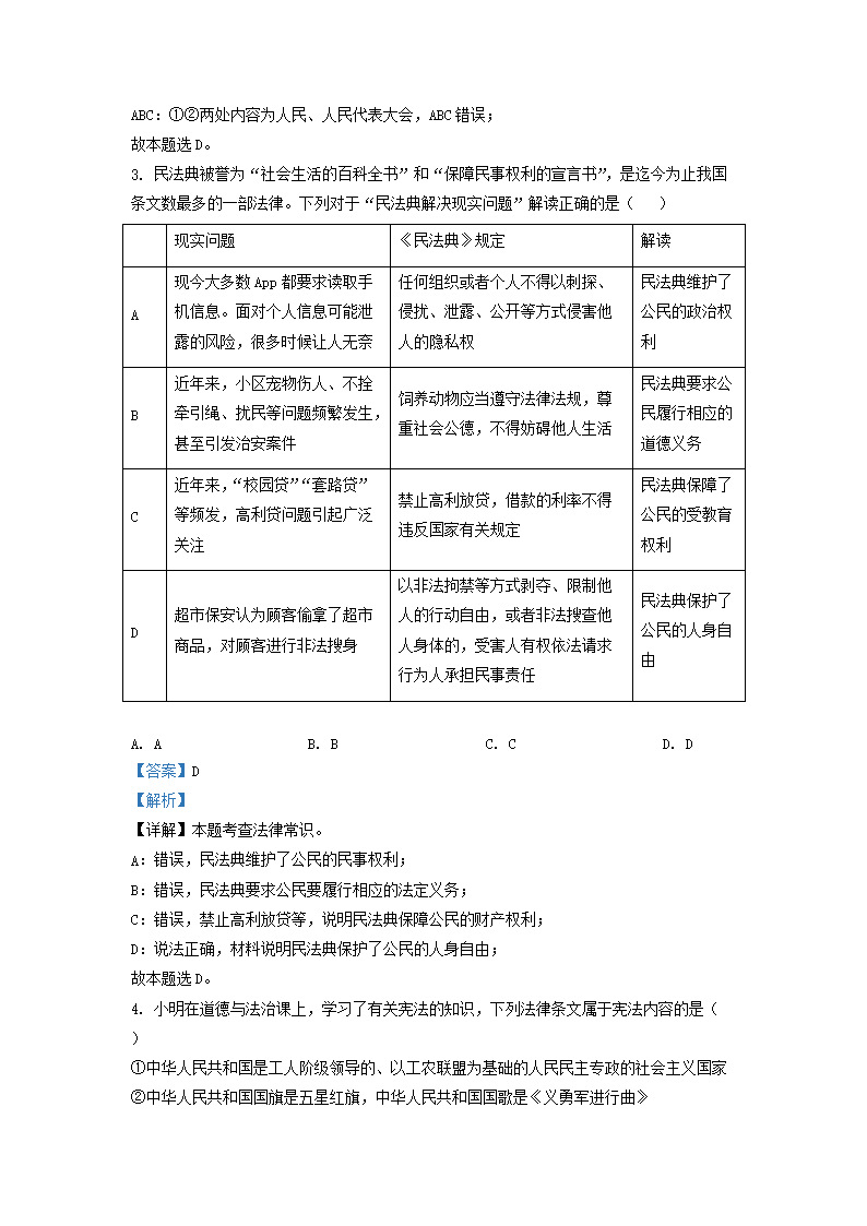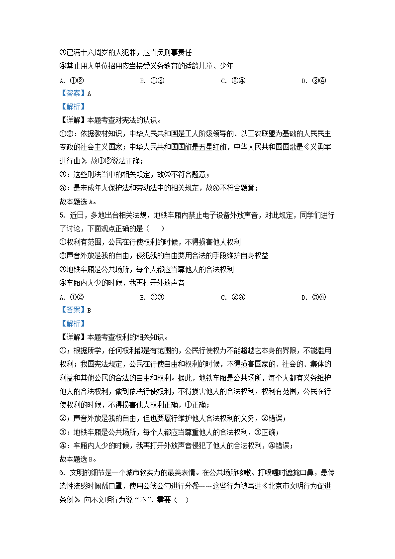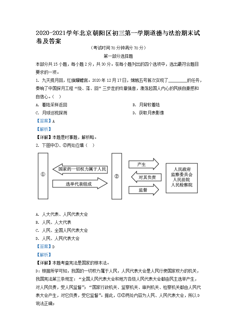 2020-2021学年北京朝阳区初三第一学期道德与法治期末试卷及答案(Word版)07-20