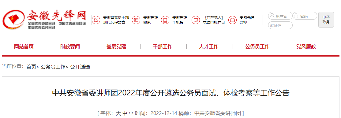 原文标题:中共安徽省委讲师团2022年度公开遴选公务员面试、体检考察等工作公告