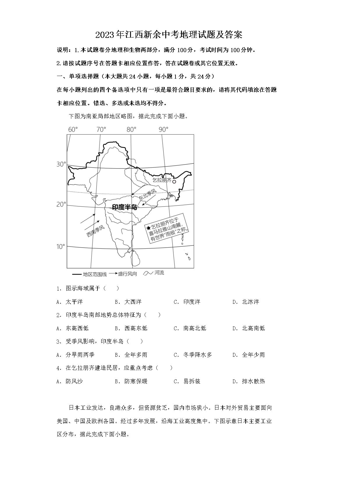 2023年江西新余中考地理试题及答案(Word版)07-01