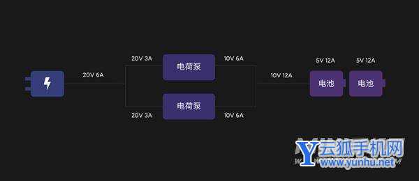 在两条充电通路上分别搭载超高效的定制电荷泵充电芯片,组成双电荷泵并联架构。