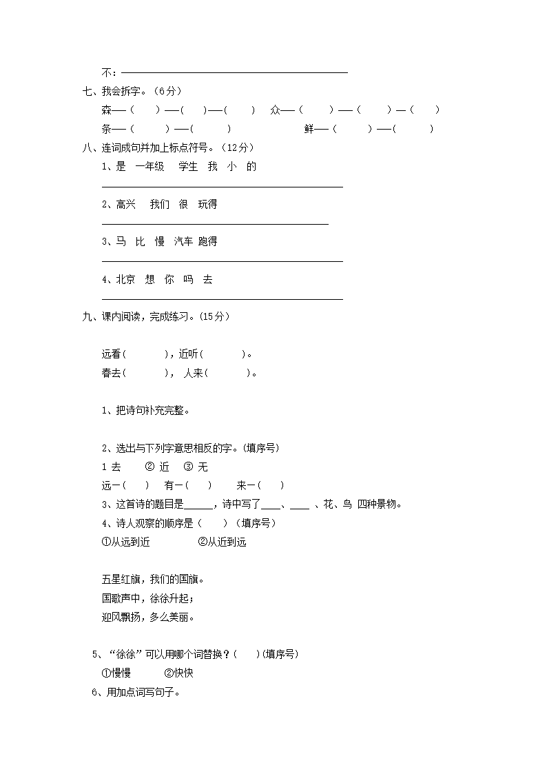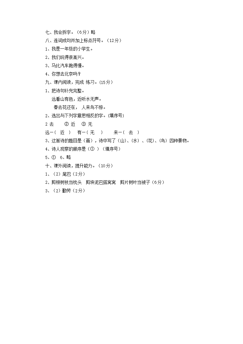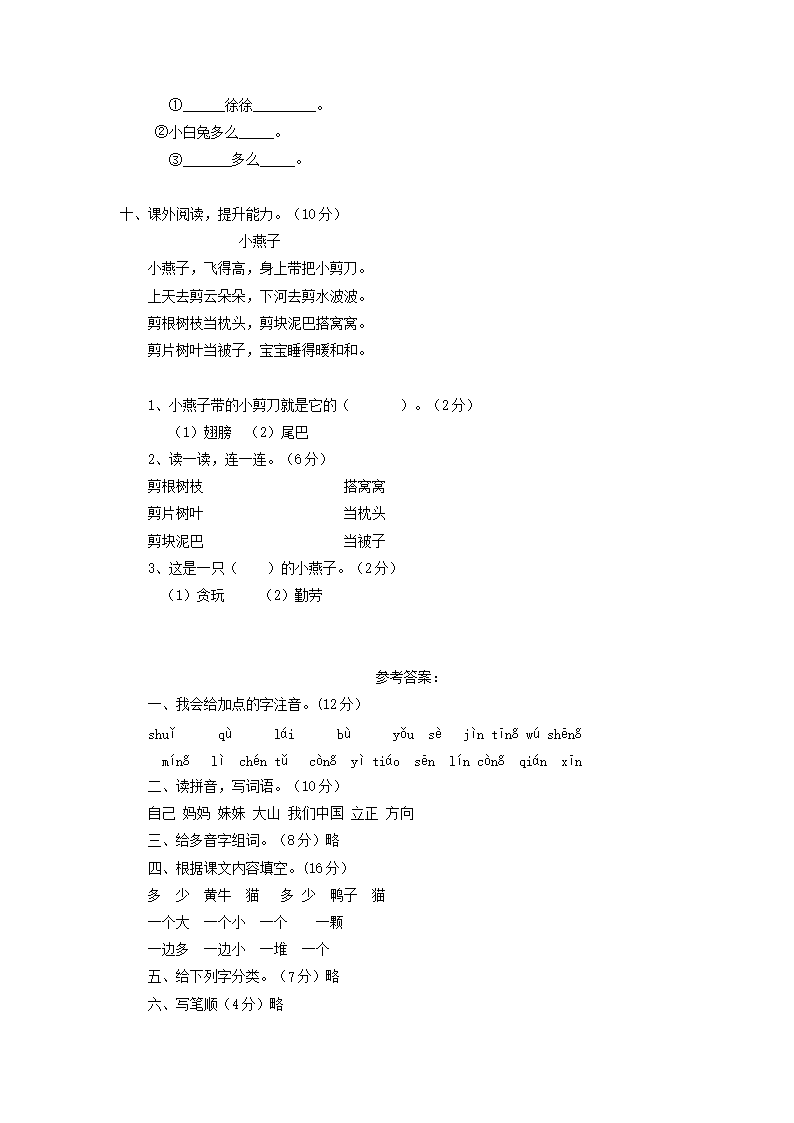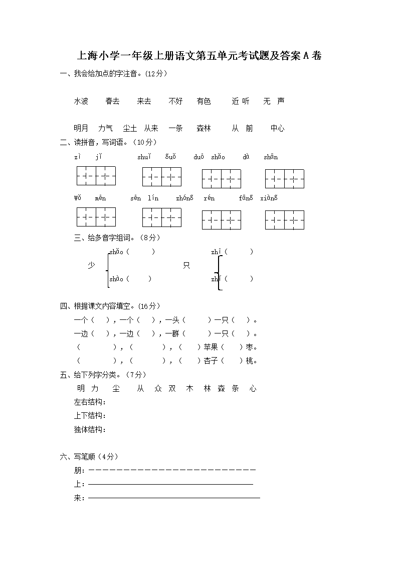 上海小学一年级上册语文第五单元考试题及答案A卷(Word版)10-25