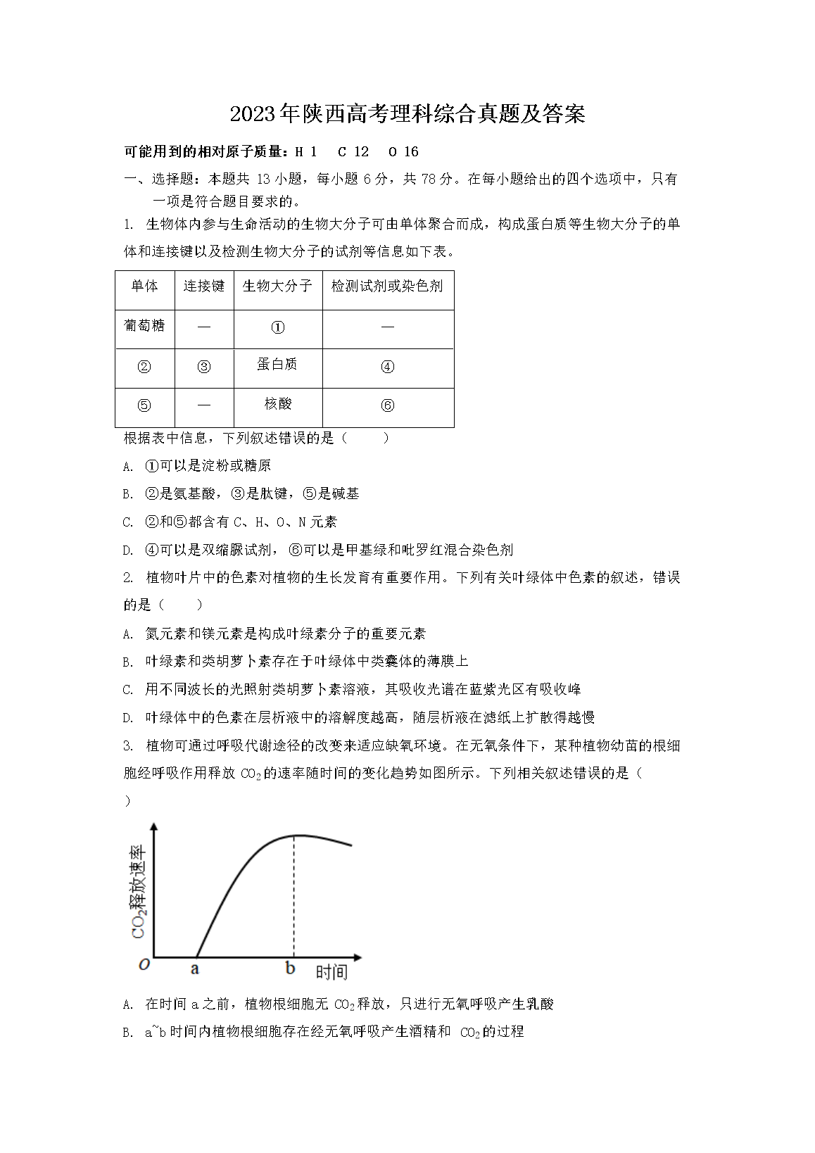 2023年陕西高考理科综合真题及答案(Word版)06-16