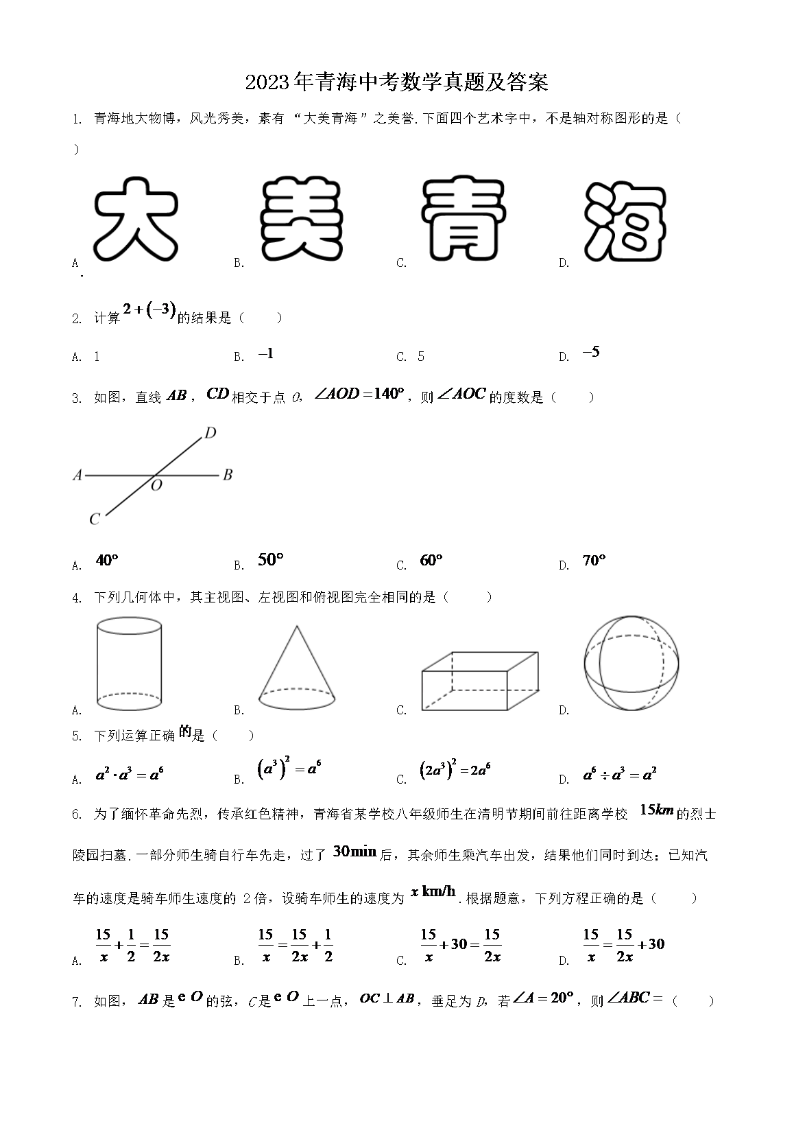 2023年青海中考数学真题及答案(Word版)10-14