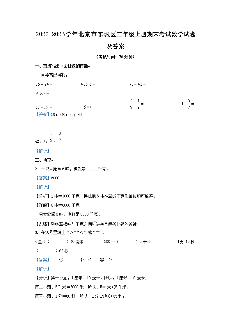 2022-2023学年北京市东城区三年级上册期末考试数学试卷及答案(Word版)06-26