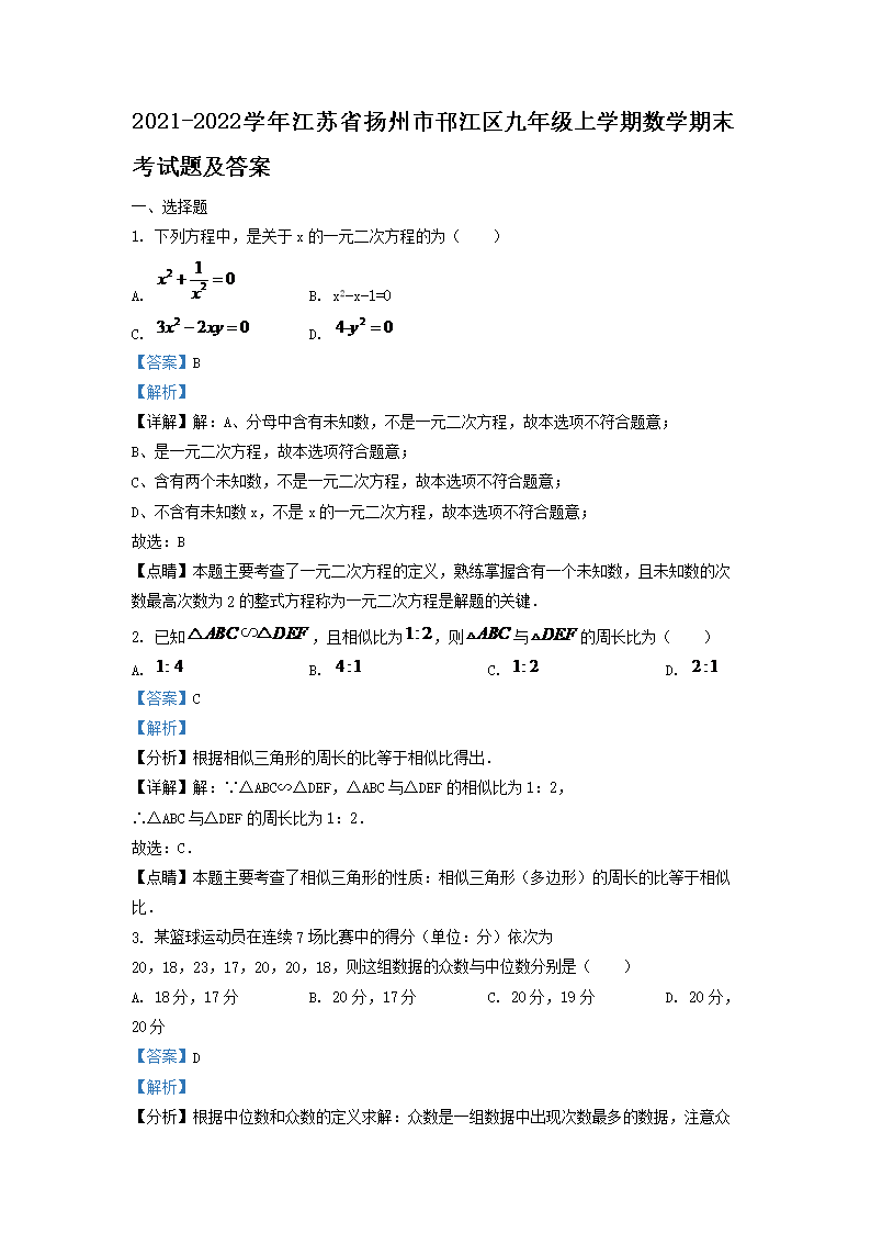 【文档预览】 文档大全网整理发布2021-2022学年江苏省扬州市邗江区九年级上学期数学期末考试题及答案(Word版),前五页预览如下:
