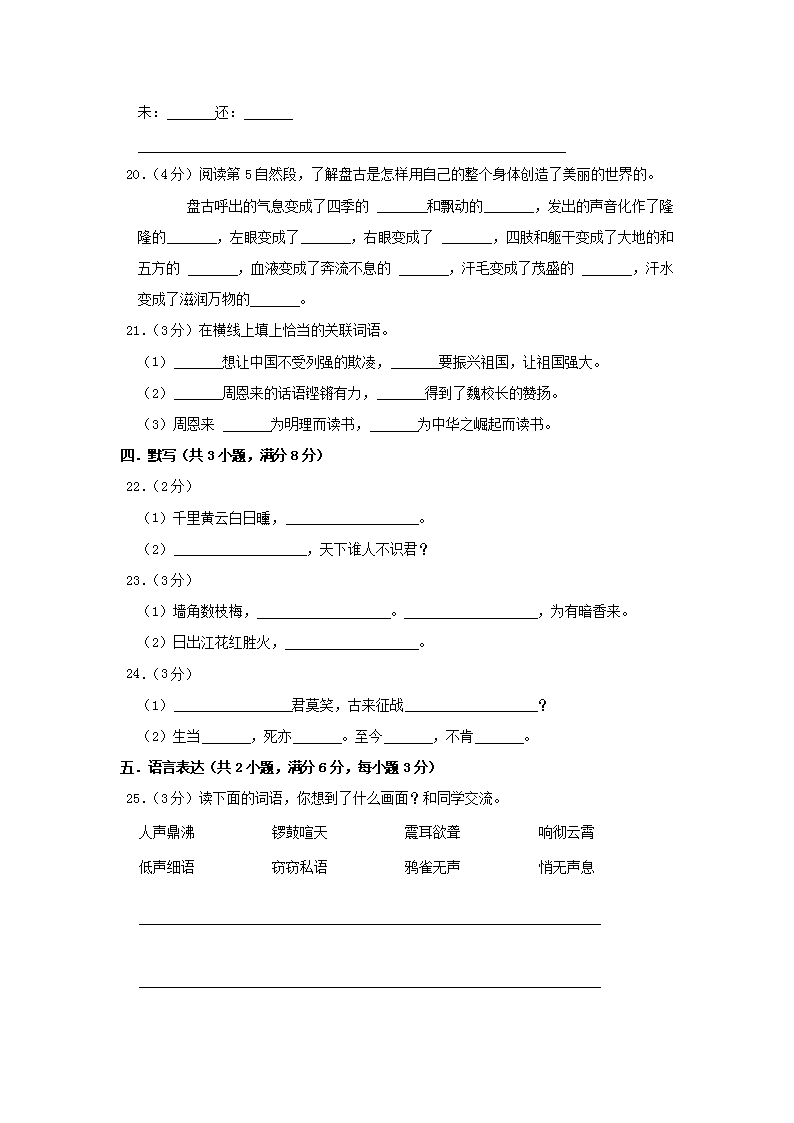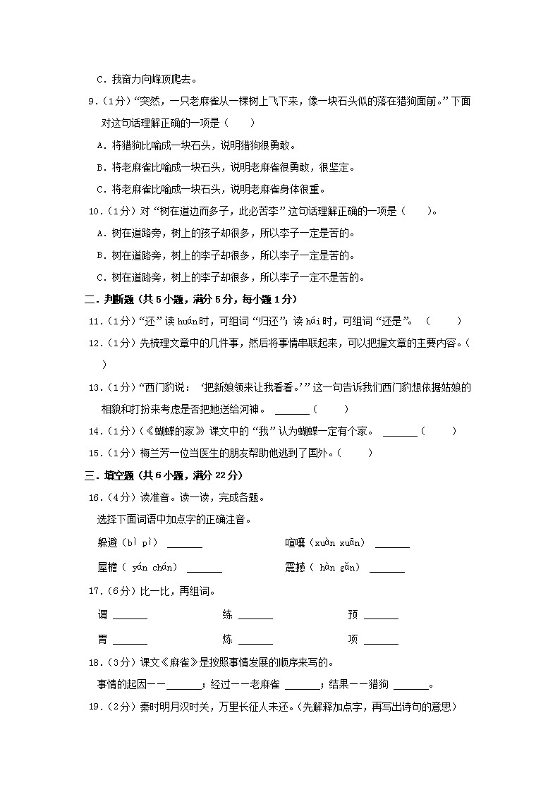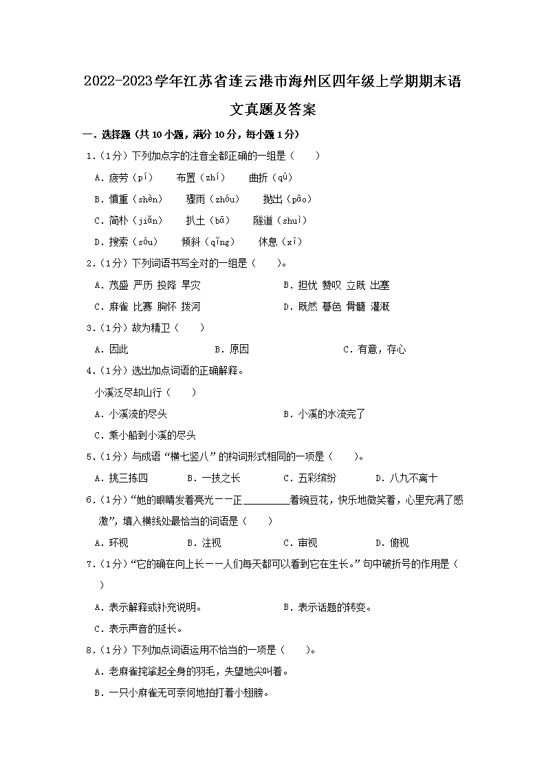 2022-2023学年江苏省连云港市海州区四年级上学期期末语文真题及答案(Word版)09-15