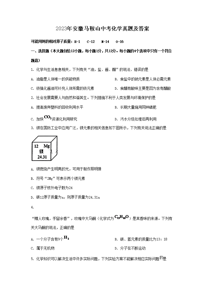 【文档预览】 文档大全网整理发布2023年安徽马鞍山中考化学真题及答案(Word版),前五页预览如下: