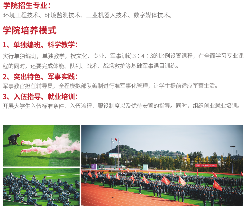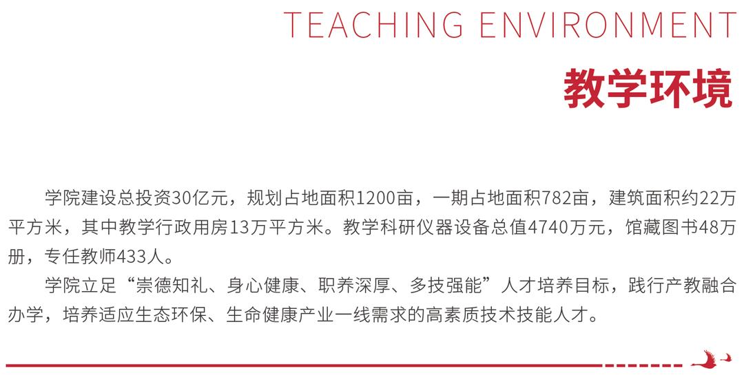 学院开设环境工程技术、水环境智能监测与治理、环境检测技术、护理、婴幼儿托育服务与管理、电商、大数据与会计、工业机器人技术、食品质量与安全、数字媒体、高速铁路客运服务、旅游管理、环境艺术设计等80余个专业及方向。