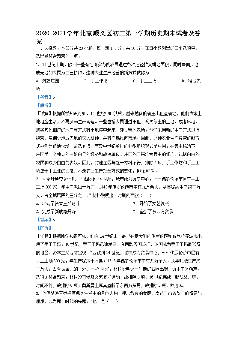 【文档预览】 文档大全网整理发布2020-2021学年北京顺义区初三第一学期历史期末试卷及答案(Word版),前五页预览如下: