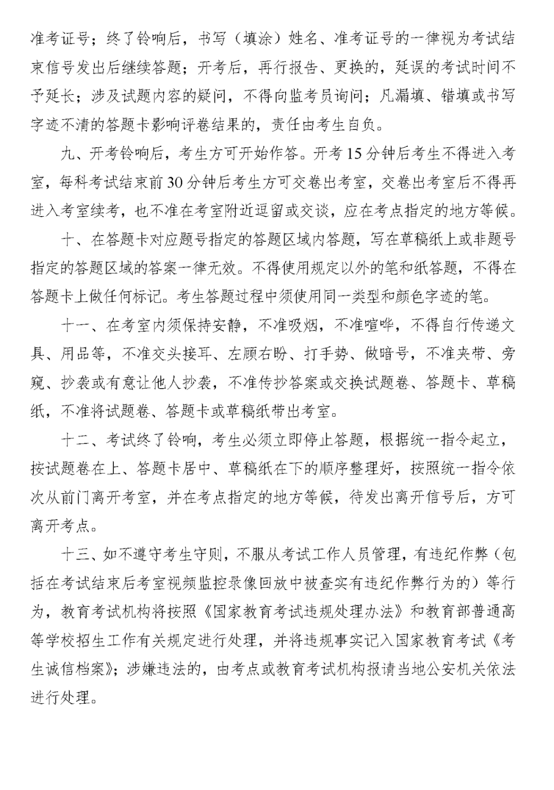 13.考生必须听从考务工作人员指挥,不得在考场喧哗或打闹,不得干扰考试的正常进行。对于在考场寻衅滋事的考生,由保卫部门报派出所按照治安条例处理。