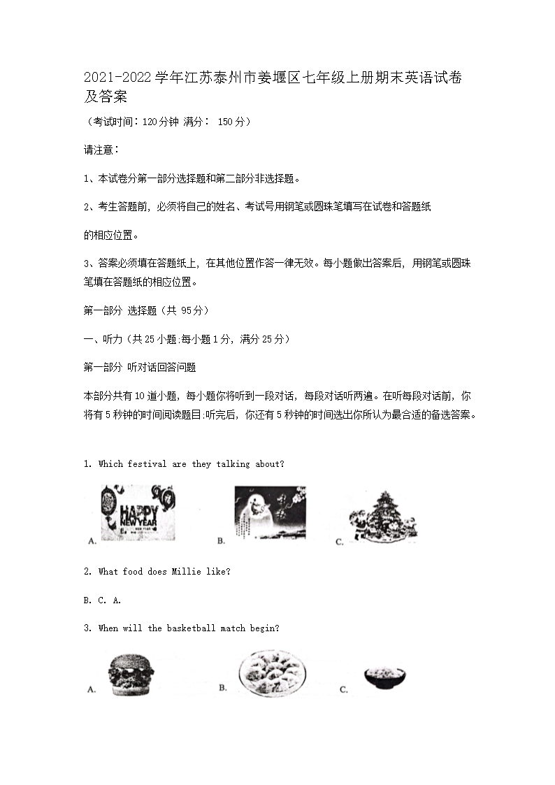 【文档预览】 文档大全网整理发布2021-2022学年江苏泰州市姜堰区七年级上册期末英语试卷及答案(Word版),前五页预览如下: