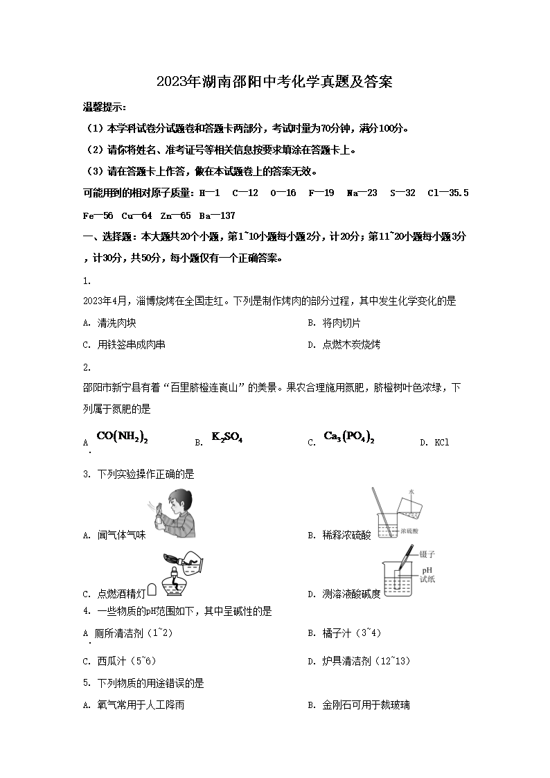2023年湖南邵阳中考化学真题及答案(Word版)07-22