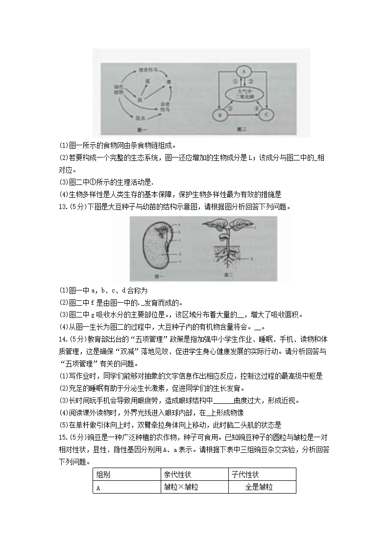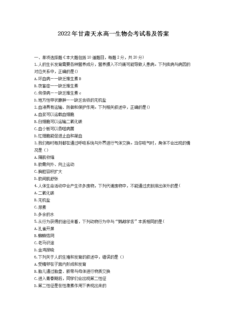 2022年甘肃天水高一生物会考试卷及答案(Word版)06-30