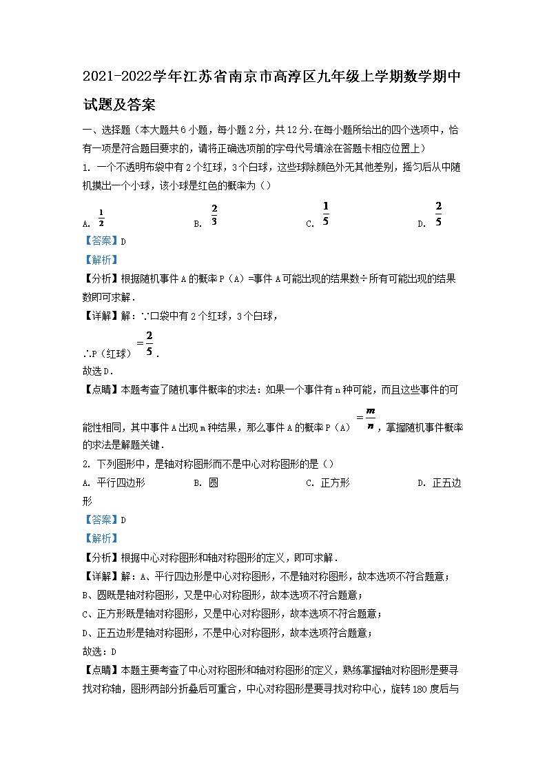 【文档预览】 文档大全网整理发布2021-2022学年江苏省南京市高淳区九年级上学期数学期中试题及答案(Word版),前五页预览如下: