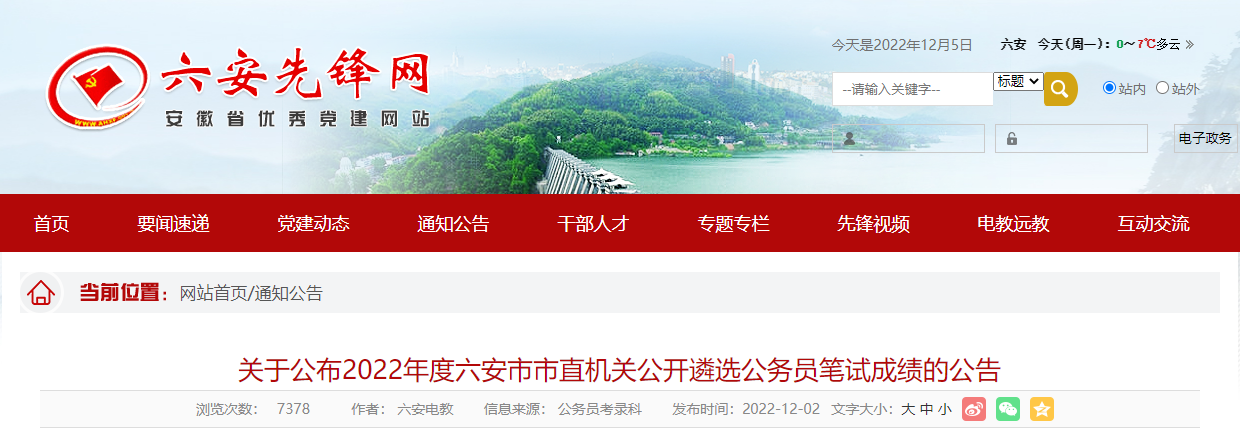 2022年安徽六安市直机关公开遴选公务员笔试成绩公布12-06