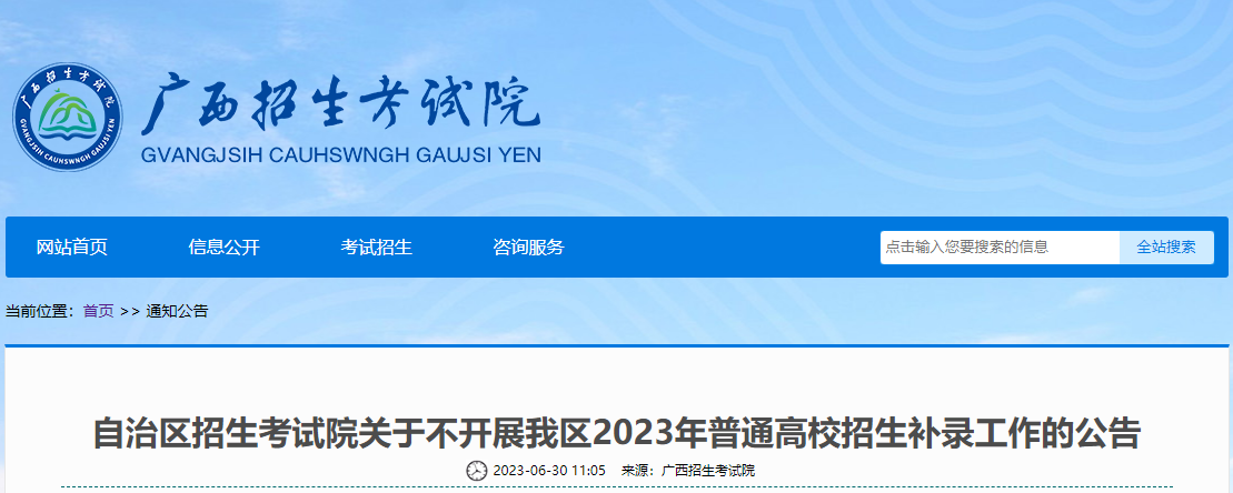 根据《教育部关于做好2023年普通高校招生工作的通知》(教学﹝2023﹞1号)精神,结合我区实际,今年普通高校招生高职高专普通批录取工作结束后,不开展补录工作(注:征集志愿录取工作视计划完成情况继续开展,请考生及时关注广西招生考试院网站普通高考通知公告)。