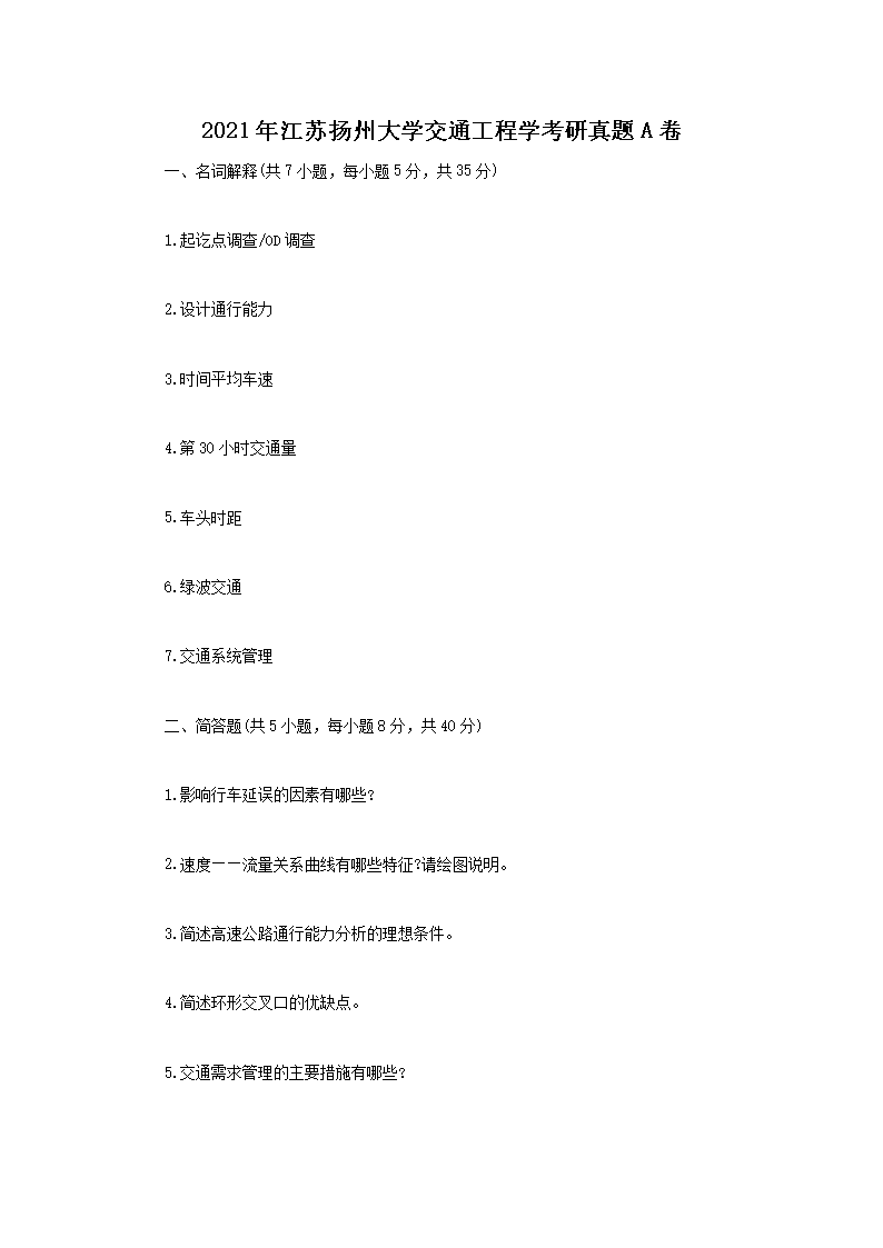 2021年江苏扬州大学交通工程学考研真题A卷(Word版)08-31