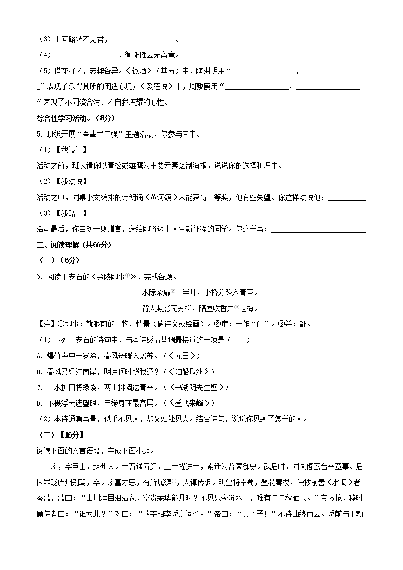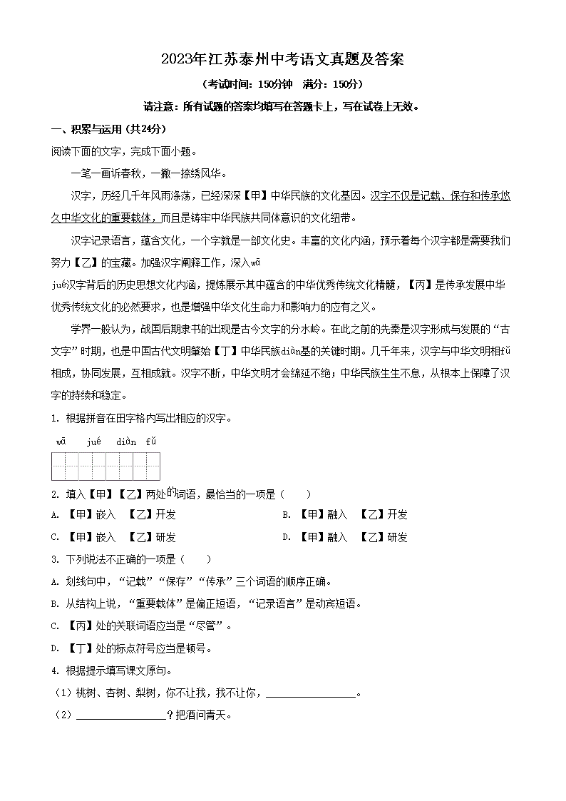 2023年江苏泰州中考语文真题及答案(Word版)10-08