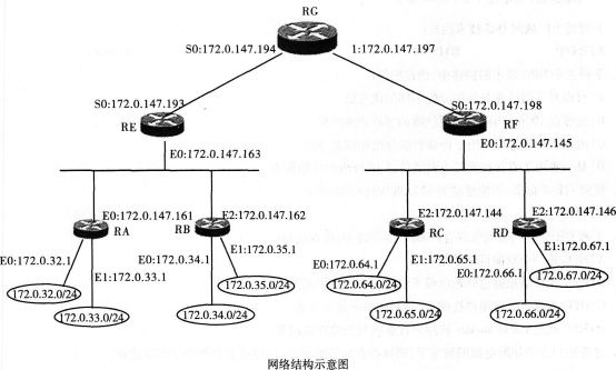 2.如果需要监听路由器RE和RG设备之间的所有流量,可以在该链路中串入一种设备。请写出这种设备的名称。(2分)