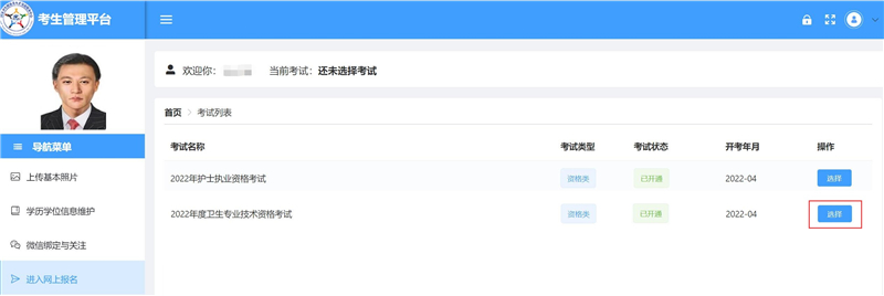 (一)点击【进入网上报名】,选择“2022年度卫生专业技术资格考试”。