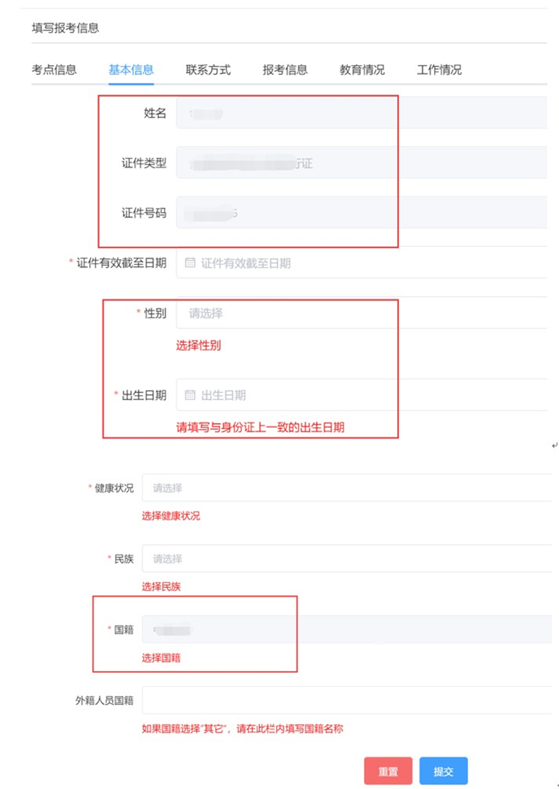 (2)填写基本信息后,姓名、证件类型、证件号码均无法自行修改,如需修改请查看《考生申请修改/删除注册信息须知》(点击查看)。