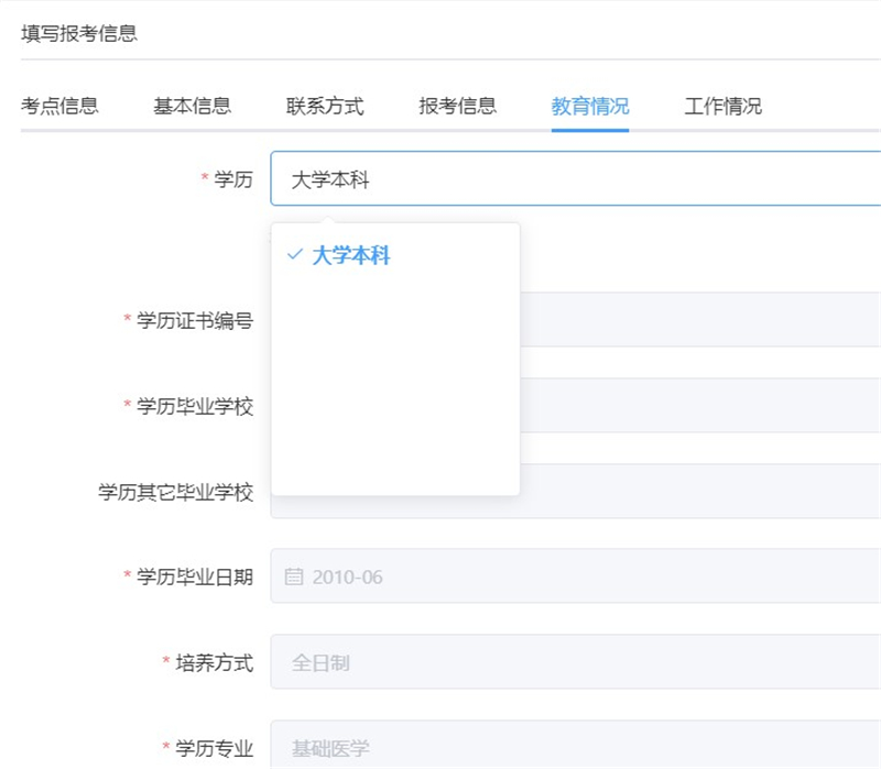 自动确认涉及的信息包括:报考考区、考点、报考专业、报考级别、毕业学校、学校备注、毕业时间、毕业专业、学位、学制、学历、学历证书编号、单位名称、单位所属、单位性质。