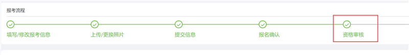分为考点初审和考区终审两个阶段,考生可在【报考流程】处查看资格审核状态,考区终审通过后,“资格审核”节点变为绿色。